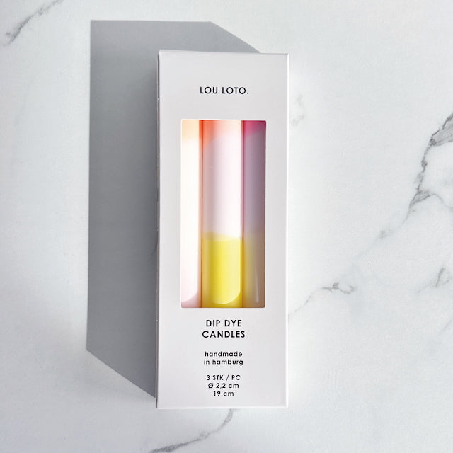 In der Kerzenbox NO.01 befinden sich drei handgefärbte Dip Dye Kerzen in aufeinander abgestimmten Farben.