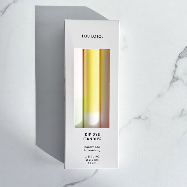 In der Kerzenbox NO.04 befinden sich drei handgefärbte Dip Dye Kerzen in aufeinander abgestimmten Farben.