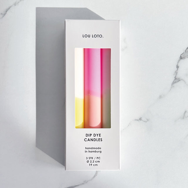 In der Kerzenbox NO.05 befinden sich drei handgefärbte Dip Dye Kerzen in aufeinander abgestimmten Farben.