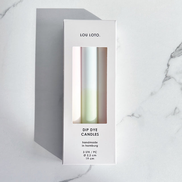 In der Kerzenbox NO.06 befinden sich drei handgefärbte Dip Dye Kerzen in aufeinander abgestimmten Farben.