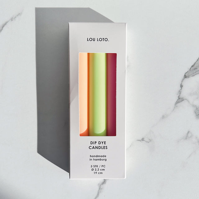 In der Kerzenbox NO.07 befinden sich drei handgefärbte Kerzen in aufeinander abgestimmten Neon-Farben.