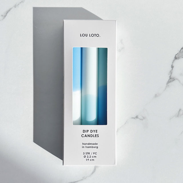 In der Kerzenbox NO.13 befinden sich drei handgefärbte Dip Dye Kerzen in aufeinander abgestimmten Farben.