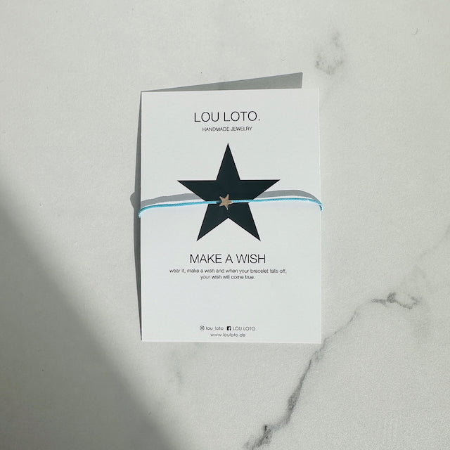 Ein kleines Armband mit großer Bedeutung: Unsere Make a Wish Armbänder bestehen aus einem feinen, verstellbaren Baumwollfaden und einer zarten Metallperle in Form eines Sterns. Trage dein Armband, denke an deinen Wunsch – und wenn das Band eines Tages abfällt, soll er in Erfüllung gehen. Jedes Armband kommt auf einer liebevoll gestalteten „Make a Wish“-Karte – perfekt als kleines Geschenk, Mitbringsel oder für dich selbst.