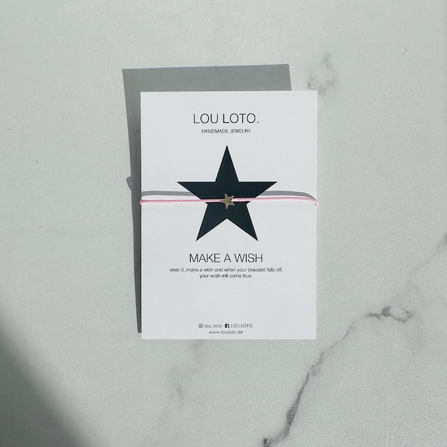 Ein kleines Armband mit großer Bedeutung: Unsere Make a Wish Armbänder bestehen aus einem feinen, verstellbaren Baumwollfaden und einer zarten Metallperle in Form eines Sterns. Trage dein Armband, denke an deinen Wunsch – und wenn das Band eines Tages abfällt, soll er in Erfüllung gehen. Jedes Armband kommt auf einer liebevoll gestalteten „Make a Wish“-Karte – perfekt als kleines Geschenk, Mitbringsel oder für dich selbst.