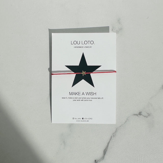Ein kleines Armband mit großer Bedeutung: Unsere Make a Wish Armbänder bestehen aus einem feinen, verstellbaren Baumwollfaden und einer zarten Metallperle in Form eines Sterns. Trage dein Armband, denke an deinen Wunsch – und wenn das Band eines Tages abfällt, soll er in Erfüllung gehen. Jedes Armband kommt auf einer liebevoll gestalteten „Make a Wish“-Karte – perfekt als kleines Geschenk, Mitbringsel oder für dich selbst.