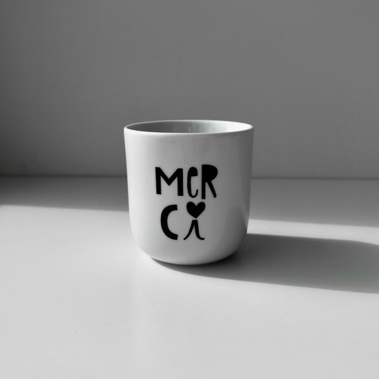 Der Porzellanbecher ist skandinavisch, minimalistisch designt: Ohne Henkel und mit schwarzem Druck fügt er sich in jedes Zuhause perfekt ein.